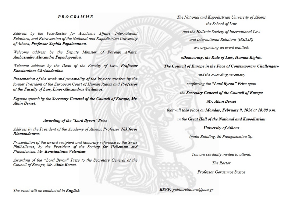 The award ceremony will take place on Monday 9 February 2026 at 18.00 in the central premises of the National and Kapodistrian University of Athens (Panepistimiou 30, Athens 10679/ Map).