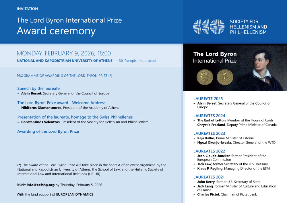 The Society for Hellenism and Philhellenism (SHP) has instituted since 2021 the International Lord Byron Philhellenism Award in the name of the great poet and Philhellene, Lord Byron.
